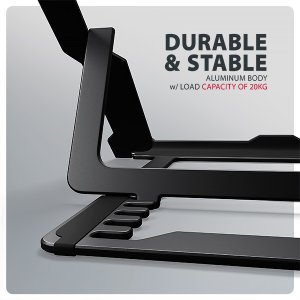 Vlastnosti: • Lehká a pevná kovová konstrukce. • Protiskluzová úprava, která zároveň chrání zařízení od poškrábání. • Vhodný pro 10"–17.3" notebooky nebo jiná zařízení. • Osm nastavitelných pozic. • Nastavitelná výška 91–150 mm. • Nosnost dimenzována pro všechny typy notebooků: max. 20 kg. • Skladný a lehce složitelný. • Držák notebooku umožňuje lepší odvod tepla. • Rozměry: 220 × 230 × 15 mm (Š × H × V). • Hmotnost: 312 g.
