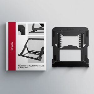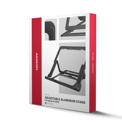 AXAGON STND-LAB je stojan na notebook či tablet, který zajišťuje pohodlí a zlepšuje ergonomii při práci. Je ideální pro zařízení s úhlopříčkou od 10" do 17.3" a umožňuje nastavení až osmi poloh. Snadno tak najdete ideální sklon stojanu pro maximální uvolnění vašich krčních a zádových svalů. Užijte si komfortní pracovní prostředí s kompaktním a přenosným stojanem, který se dokonale přizpůsobí vašim potřebám, ať už pracujete doma, v kanceláři, nebo na cestách. Podstavec je vyroben z hliníkových odlitků garantujících dlouhou životnost a spolehlivost. Díky protiskluzové úpravě se nemusíte obávat nežádoucích pohybů – vaše zařízení zůstane pevně na svém místě, a to bez poškození povrchu notebooku či podložky. Tyto pečlivě navržené vlastnosti zaručují perfektní stabilitu pro váš notebook, tablet nebo dokonce oblíbenou knihu, což vám poskytne klid a pohodlí při každodenním používání. Velkou výhodou je možnost nastavení až osmi poloh. Díky tomu můžete notebook zvednout do výšky od 91 do 150 mm. Tím získáte další pracovní plochu ve správné úrovni očí, což výrazně zlepšuje ergonomii a pohodlí při práci, a zároveň zvyšuje vaši produktivitu. Stojan lze snadno složit do kompaktních rozměrů, což umožňuje pohodlné přenášení kamkoli potřebujete. Jeho elegantní design v černé barvě nejen stylově doplní váš pracovní stůl, ale také přináší praktické funkce, které oceníte při každodenním používání. Provedení zajišťuje ideální odvod tepla z vašeho notebooku, čímž zvyšují jeho výkon a životnost.
