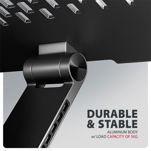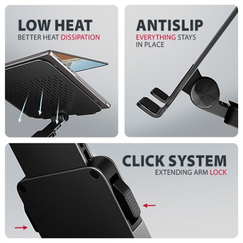 Vlastnosti: • Lehká a pevná kovová konstrukce. • Protiskluzová úprava, která zároveň chrání zařízení od poškrábání. • Vhodný pro 10"–17.3" notebooky nebo jiná zařízení. • Otočný mechanismus ramene (360° kolem své osy). • Nastavitelná výška až 260 mm. • Mnoho nastavitelných poloh. • Nastavení sklonu plochy pro notebook (0–180°). • Nastavení sklonu ramene (0–180°). • Nastavitelný výsuv ramene (0–60 mm, 7 pozic). • Nosnost dimenzována pro všechny typy notebooků, max. 5 kg. • Skladný a lehce složitelný. • Držák notebooku umožňuje lepší odvod tepla. • Rozměry: 260 × 232 × 58 mm (Š × H × V). • Hmotnost: 1095 g.