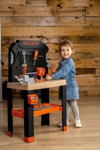 Realistické centrum pracovního stolu Smoby Black+Decker s 78 díly příslušenství a 7 nástroji. Velký, robustní pracovní stůl vypadá jako skutečný tátův pracovní stůl. Velká pracovní plocha v dřevěném designu nabízí dostatek prostoru pro různé nářadí. Vybavení je doplněno šroubovou svorkou a posuvným pravítkem. Spousta úložných přihrádek na šrouby a hřebíky. Se zábavnou zatloukací funkcí hřebíků. Tento výrobek obsahuje minimálně 75 % recyklovaného materiálu. Rozměry produktu (DxŠxV): 36 x 57,5 x 88 cm.