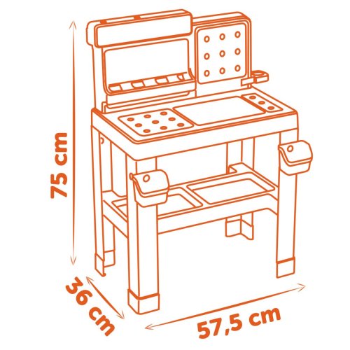 Realistické centrum pracovního stolu Smoby Black+Decker s 83 díly příslušenství , 7 nástroji a vozidlem . Velký, robustní pracovní stůl vypadá jako skutečný tátův pracovní stůl. Velká pracovní plocha v dřevěném designu nabízí dostatek prostoru pro různé nářadí. Mechanickým akumulátorovým šroubovákem lze ze stavebních bloků sešroubovat různá vozidla. Vybavení je doplněno šroubovou svorkou a posuvným pravítkem. Spousta úložných přihrádek na šrouby a hřebíky. Se zábavnou zatloukací funkcí hřebíků. Tento výrobek obsahuje minimálně 65 % recyklovaného materiálu. Rozměry produktu (DxŠxV): 36 x 57,5 x 75 cm.
