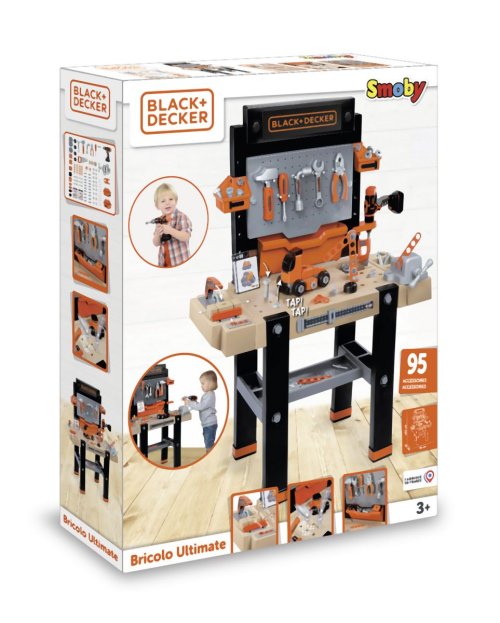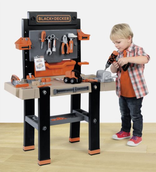 Elektronický pracovní stůl ve struktuře dřeva s přídavnou přihrádkou. Obsahuje 94 dílů příslušenství vč. akumulátorového šroubováku a kotoučové pily a sadou k výrobě vozidla. Rozměry: 79 x 103 x 34 cm.