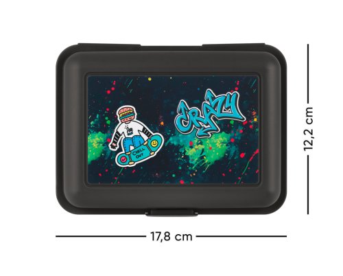 • Plastový box na svačinu v černé barvě. • Box má uzavírání na jeden zámek a dělicí přepážku. • Nedoporučujeme mýt v myčce.