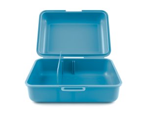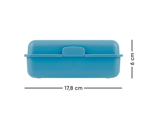 • Plastový box na svačinu v modré barvě. • Box má uzavírání na jeden zámek a obsahuje dělicí přepážku. • Nedoporučujeme mýt v myčce.