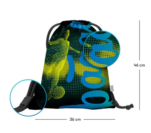 • Sáček na obuv či jiné drobnosti pro vaše volnočasové aktivity. • Sáček je vyroben z pevného omyvatelného materiálu. • Zdrhování pomocí pevných tkanic, které zároveň umožňují nošení na zádech.