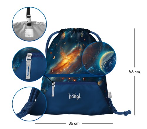 • Praktický sáček s kapsou na zip je vhodný nejen na přezůvky do školy, ale také na cesty, do města, na sportovní či jiné volnočasové aktivity.