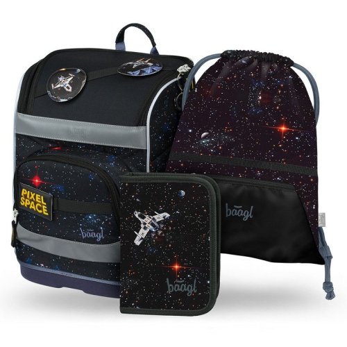 Školní set s vesmírným motivem sestávající z ergonomické aktovky Zippy Plus, klasického dvouchlopňového penálu a sáčku na obuv obsahuje všechny nezbytné školní potřeby.