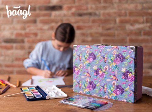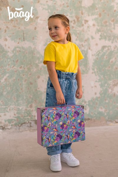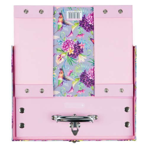 • Skládací kufřík z pevného laminovaného papíru s okovanými rohy.