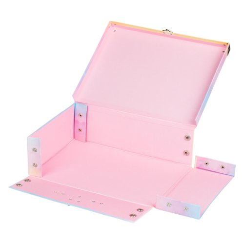 • Skládací kufřík z pevného laminovaného papíru s okovanými rohy.