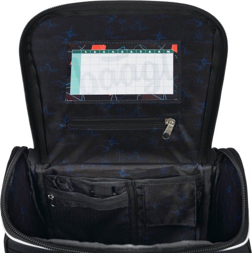 • Uvnitř aktovky je průhledná kapsa s rozvrhem a vnitřní organizér umožňující rovnoměrné rozložení hmotnosti, doplněný gumičkou pro fixaci.