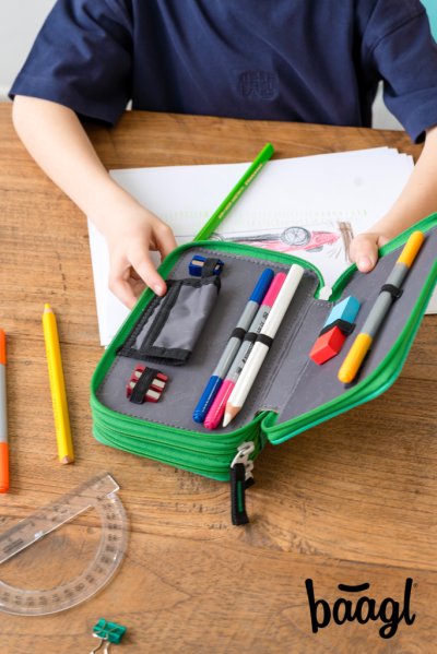 • Extra prostorné třípatrové penály na všechny psací potřeby.