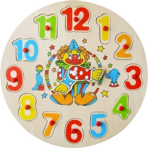 Na výběr jsou dva motivy - s klaunem nebo se zajícem. Děti se pomocí těchto hodin učí čísla a hodiny. Čísla jsou vyndavací a každé pasuje pouze na své místo, ručičky jsou pohyblivé. Z kolekce dřevěné hračky od kvalitní značky Studo Wood. - Rozměry: 30 x 3
