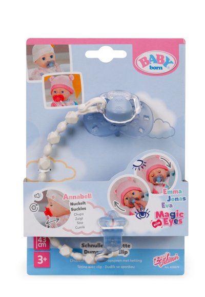 BABY born dudlík se sponkou, 2 druhy pro funkční panenky velikosti 43 cm. • Panenky reagují na dudlík • Annabell a Alexander sají dudlík • Emma, Eva a Jonas zavírají oči při otáčení dudlíku • Perfektní doplněk k hraní si s panekami • Vhodné pro funkční panenky velikosti 43 cm: kompatibilní s Emmou, Evou, Jonasem, Annabell, Alexandrem a Leah.