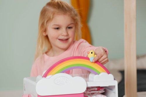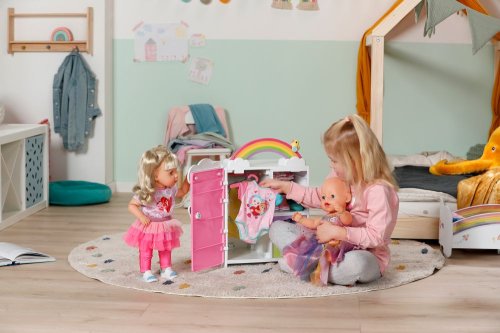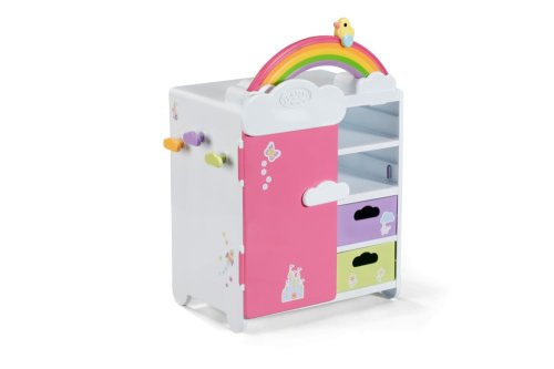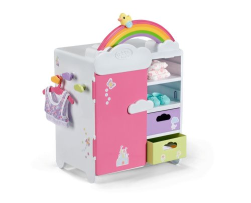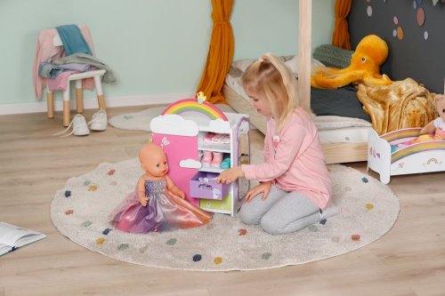 S duhovou šatní skříní BABY born je převlékání skvělá zábava! Když je kačenka Berta tlačena po duze, duha se rozsvítí. Berta hraje při vybírání outfitu veselou melodii, která jí dodává dobrou náladu. Díky šatní tyči, poličkám a zásuvkám je ve skříni dostatek místa na oblečení pro panenky. Kabelky nebo jiné věci na zavěšení lze pověsit na roztomilé háčky ve tvaru obláčků na vnější straně skříně. Kompletní outfit BABY born můžete obdivovat ve velkém zrcadle. Samotnou šatní skříň lze pomocí archu samolepek ještě více vyzdobit.