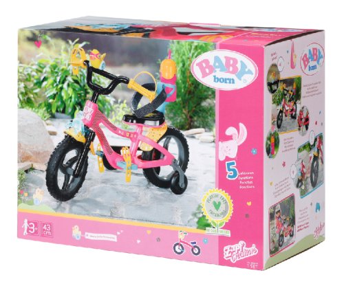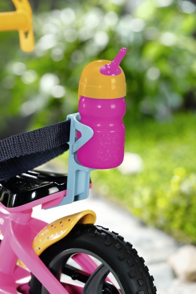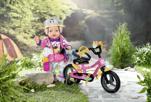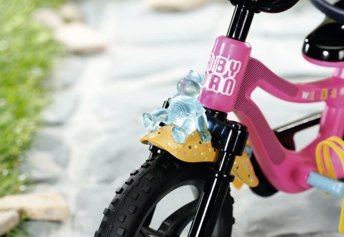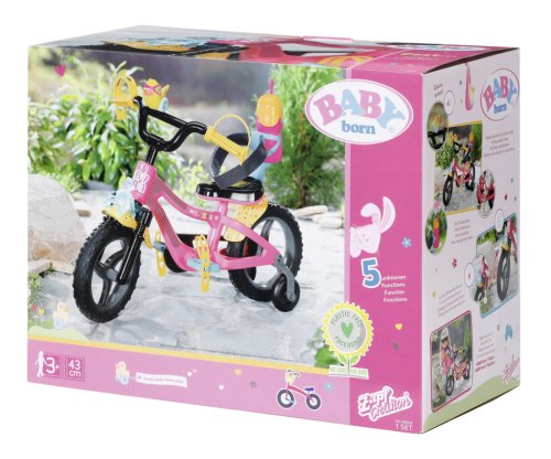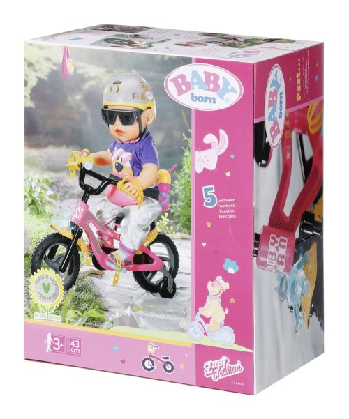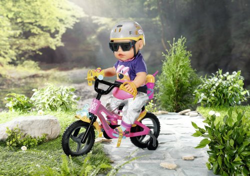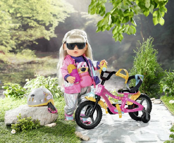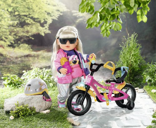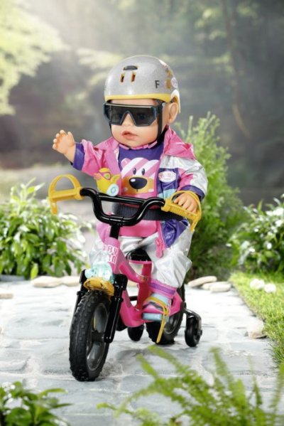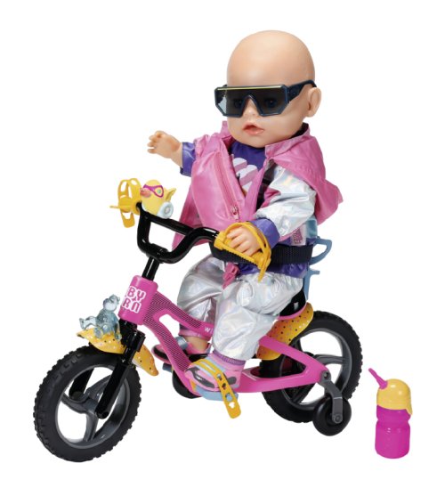 BABY born se se svým kolem vydala do bikeparku. Má totiž terénní kolo. S pneumatikami s terénním profilem, které dokážou přejet přes všechny překážky a také všechny rampy. Růžové kolo je vybaveno žlutými blatníky s barevnými puntíky, aby pak na oblečení nebyly tolik vidět cákance bláta. Klakson ve tvaru kačenky a světlo ve tvaru medvídka jsou díky zvuku a blikajícímu světlu zárukou toho, že BABY born nikdo nepřehlédne. Žluté pásky na ruce a nohy a bezpečnostní popruh udržují malou závodnici pevně v sedle. Stabilizační kolečka zaručují nezbytnou rovnováhu. Přijde-li po cestě žízeň, je zde ještě barevně sladěná láhev na kolo.