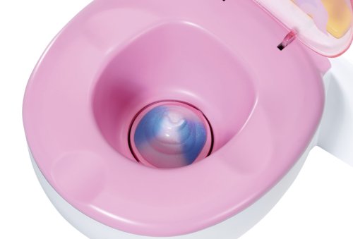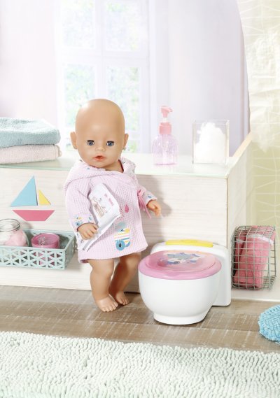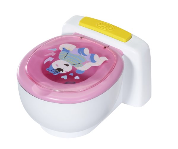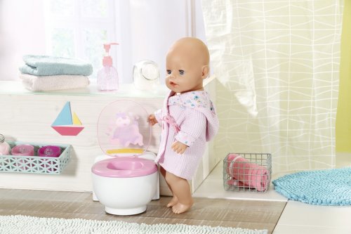 BABY born už chodí na záchod! Jakmile se posadí na svůj bílý trůn s růžovým sedátkem, uslyšíš zvuky čůrání, potlesku a veselého smíchu. BABY born se ale umí i vykakat. V tom případě se v míse objeví barevné třpytivé kakání. Rychle, je čas spláchnout! Když stiskneš splachovací tlačítko, kakání zmizí a uslyšíš zvuky spláchnutí.