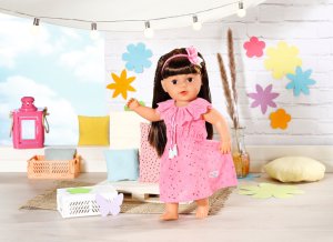 Růžové Baby Born květinové šatičky s krajkou. Součástí je čelenka a ramínko na šatičky.