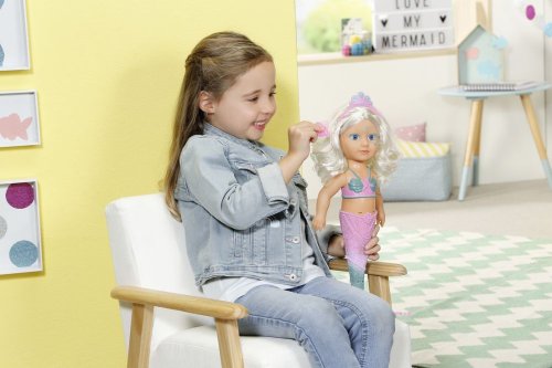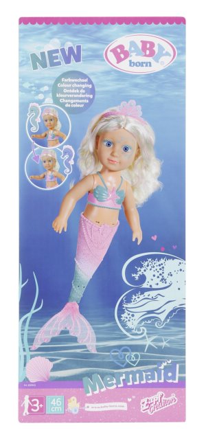 Mořské víly jsou tajemné bytosti a BABY born Mořská víla není výjimkou. Ve vodě vlní barevnou ploutví a elegantně plave. Jakmile se dostane do kontaktu se studenou vodou, změní se barva oblečku: růžová na tyrkysovou a tyrkysová na modrou. Jak jen to dělá? V dlouhých blonďatých vláskách má barevné pramínky. Vlásky má ozdobeny čelenkou. Součástí balení je také růžový hřeben, který pomáhá při tvoření krásných účesů. • BABY born Mořská víla. • Ve vodě hýbe ploutví. • S efektem změny barvy. • Rozmanitá “hra na” s panenkou BABY born povzbuzuje představivost a bylo prokázáno, že podporuje vývoj sociálních dovedností a hodnot jako je odpovědnost, komunikace a empatie. • Funguje na baterie. BABY born Mořská víla, 46 cm. Součástí je hřeben a čelenka.