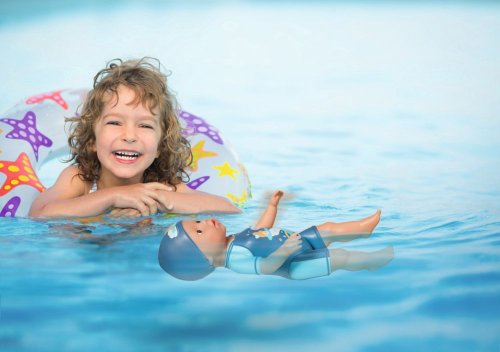 Panenka – chlapeček se sportovním duchem je jako opravdový malý delfín. V kurzu dětského plavání se hned naučil plavat kraula i motýlka. Když plave kraul, střídá ve vodě jednu ruku za druhou, u motýlka rukama hýbe nastejno. A to vše bez baterií! Stačí Plaváčkovi natáhnout ruce dozadu a je připraven na další závod. Když mu ruce uvolníš, začne ve vodě plavat. Nohy a hlava malého plavce jsou také pohyblivé, takže Plaváček může sedět na okraji bazénu a pozorovat třeba trénink skoků do vody.