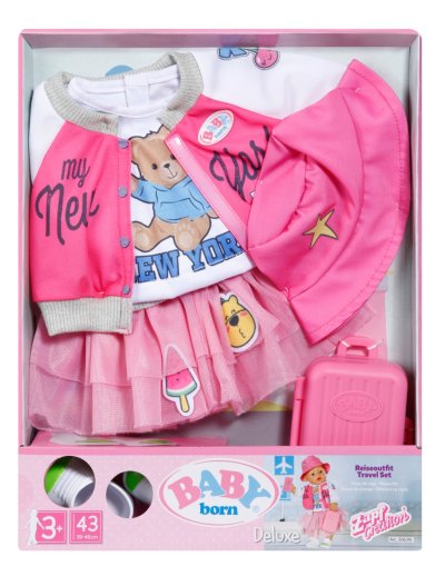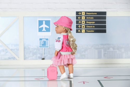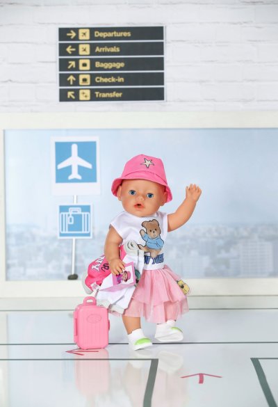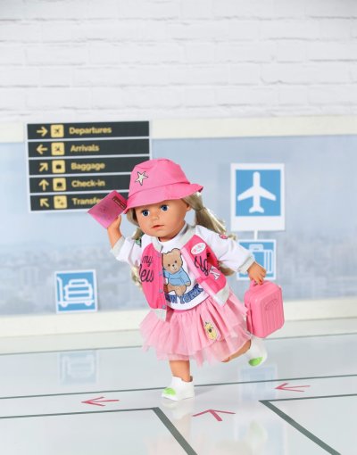 Tento outfit promění letiště v přehlídkové molo: cestovní oblečení BABY born skládající se z bundy, trička, tylové sukně, bot a čepice je dokonale sladěno. Myslelo se i na kufr – i ten se k oblečení perfektně hodí. Nezapomeňte si cestovní pas a přejeme šťastný let! • Sada se skládá z bundy, trička, tylové sukýnky, čepice a bot • S kufrem a cestovním pasem • Vhodné pro panenky velikosti 43 cm • Kvalitní oblečení a doplňky pro radost z nápadité, rozmanité a dlouhotrvající hry