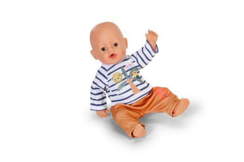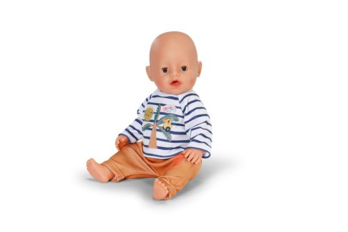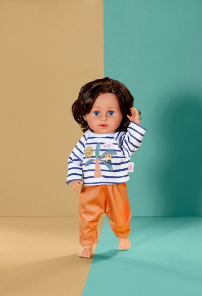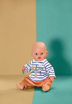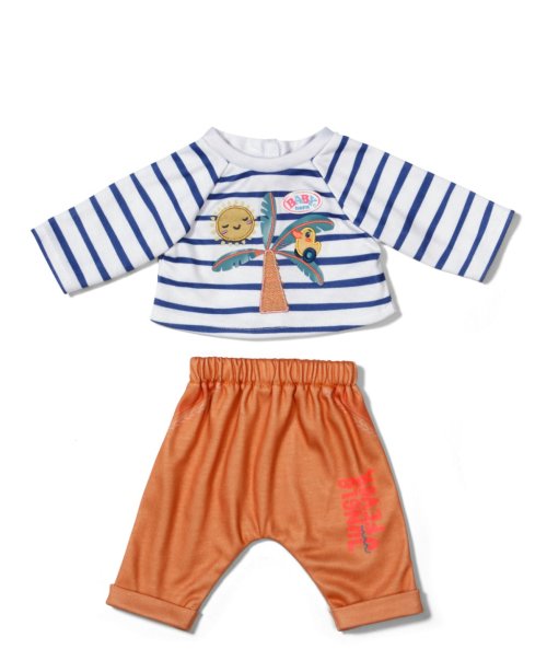 Palma, Berta, sluníčko – víc tento skvělý outfit nepotřebuje. • Pruhované tričko s dlouhým rukávem a obrázkem palmy • Oranžové kalhoty s potiskem • Vhodné pro panenky velikosti 43 cm a pro medvídky BABY born Teddy • S ramínkem z recyklovaného materiálu • Kvalitní doplněk pro radost z nápadité, rozmanité a dlouhotrvající hry