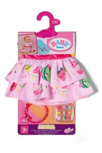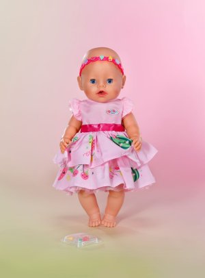 BABY born šaty s čelenkou do vlasů a nacvakávacími ozdobami pro panenky velikosti 43 cm. • Více než jen šatičky: Sada šatiček a čelenky, kterou lze různě ozdobit nacvakávacími ozdobami. • Krabička na uložení: Kromě nacvakávacích ozdob obsahuje také krabičku na jejich uložení.