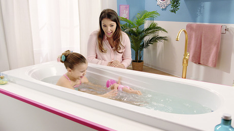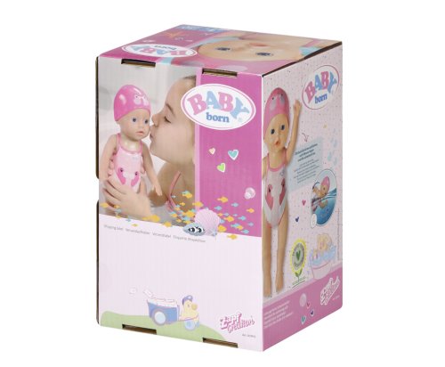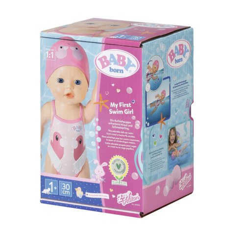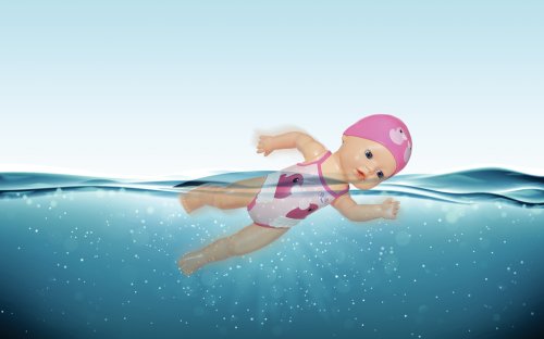 Malá holčička už se toho na hodině plavání tolik naučila. Nejraději má kraul a motýlka. Když plave kraul, střídá ve vodě jednu ruku za druhou, u motýlka rukama hýbe nastejno. A vše bez baterií! Stačí panence natáhnout ruce dozadu a je připravena na další kolo. Když jí ruce uvolníš, začne ve vodě plavat. Nohy a hlava „malého delfína“ jsou také pohyblivé, takže Plaváček může sedět na okraji bazénu a pozorovat svou maminku a tatínka. Plavací čepice a roztomilé plavky s motivem kačenky Berty a s legračními volánky jsou natištěny přímo na těle panenky jako reliéf.Plave kraula a motýlka, není třeba baterií.Tělo panenky je vyrobeno z vodotěsného materiálu. Velikost panenky 30 cm.