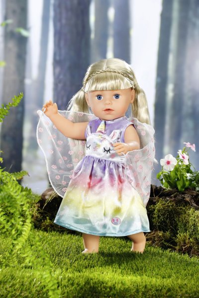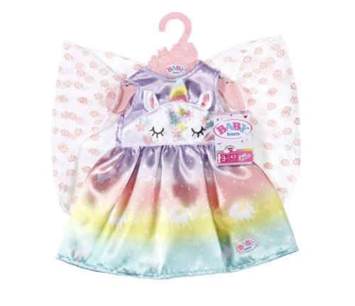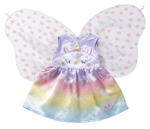 Víly a jednorožci k sobě patří stejně jako mléko a sušenky. Vílí šatičky pro panenku BABY born jsou ušity z nádherné duhové látky. Sukýnka je potištěna kouzelnými jednorožci tančícími po hvězdné obloze. Horní část šatiček je vepředu ozdobena obličejem jednorožce s našitými oušky a barevným rohem. Správná víla musí mít samozřejmě i křidélka. Průhledná křidélka s třpytivými kytičkami jsou všita do zadní části šatiček a jakmile BABY born prostrčí ruku malým očkem v horní části křidélek, otevřou se. • Originální obleček pro panenky BABY born. • Pro nápaditou, rozmanitou a dlouhotrvající hru. BABY born Pohádkový kostým "Jednorožec" pro panenky ve velikosti 43 cm. Součástí je ramínko.