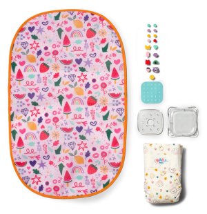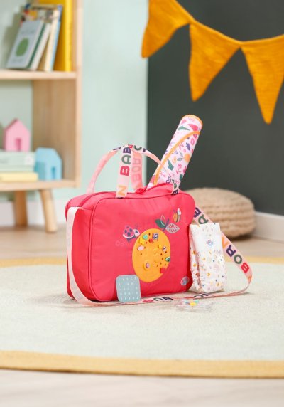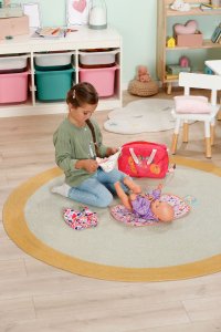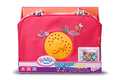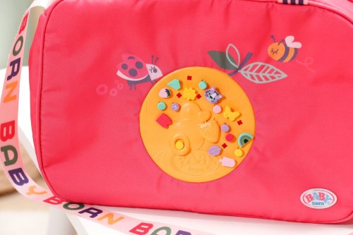 BABY born Přebalovací taška s nacvakávacími ozdobami. • Obsahuje vše pro péči o panenku: plenku, dózu na pudr a úložnou krabičku. • S nacvakávacími ozdobami: děti si mohou přebalovací tašku uzpůsobit podle své fantazie. • Podporuje „hraní si na“ a rozvoj péče o druhé. • Ideální na cesty i domů. • Pro panenky velikosti 36 cm a 43 cm. • Kvalitní doplněk pro radost z nápadité, rozmanité a dlouhotrvající hry.