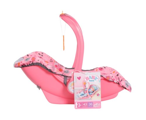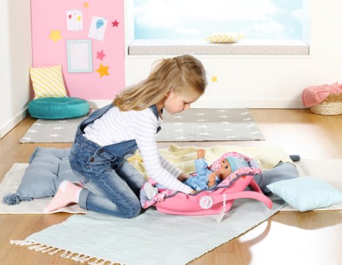 Oblíbenou činností panenky BABY born je sezení v jejím láskyplně navrženém odpočinkovém koutku. Stačí jednoduše překlopit rukojeť sedačky a je na světě perfektní sedátko. Malá průzkumnice tak může skvěle pozorovat své okolí. Systém pásů ji bezpečně drží na místě, zatímco se BABY born vrtí doleva a doprava a ukazuje sem a tam. Někdy ale není co pozorovat. V poloze na zádíčkách si pak BABY born může pohodlně zdřímnout anebo si hrát s kačenkou Bertou visící z madla. Zatímco BABY born pohodlně leží v sedačce, maminka a tatínek mohou extra lehkou sedačku pohodlně přenášet. A když se panenka BABY born nudí, může být sedačka použita jako houpačka. Jak známo, houpání uvolňuje a navozuje dobrou náladu, stejně jako látkový potah s hravým potiskem.