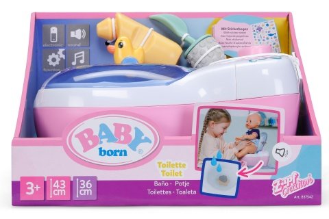 Jakmile si BABY born Emma sedne na toaletu, uslyšíte šplouchající zvuky. Pokud na ní zůstane sedět dostatečně dlouho, uslyšíte legrační melodii. Když se do toalety vyčůrá – dovnitř toalety nakape voda – objeví se uvnitř toalety díky kouzelnému vodnímu efektu obrázek čůrání a kakání. Poté toaletu nezapomeňte umýt! S WC štětkou a lahvičkou na čisticí prostředek lze toaletu udržovat čistou. Po hraní lze oba praktické doplňky uložit do přihrádek v zadní části toalety. Barevné samolepky s obrázky podvodního světa slouží k veselému ozdobení toalety. Rozměry balení 24x16x19 cm. Věk 3+