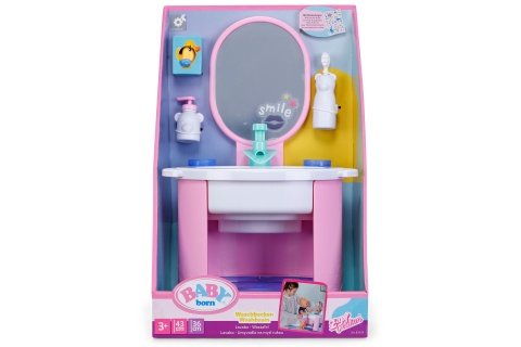 S umyvadlem BABY born se mytí rukou a čištění zubů stává skvělou zábavou. Umyvadlo je vybaveno vším, co malí rodiče panenek potřebují pro hygienu, a přináší do dětského pokoje realistickou herní zábavu. Díky čistě mechanickému vodnímu čerpadlu může z kohoutku téct skutečná voda. Malý zubní kartáček, který vibruje stejně jako elektrický kartáček, nevyžaduje žádné baterie. Samozřejmě nesmí chybět ani dávkovač mýdla. Arch samolepek umožňuje individuální ozdobení umyvadla a doplňků. Mytí rukou se tak stává skutečnou zábavou. Rozměry balení 25x41x18 cm. Věk 3+