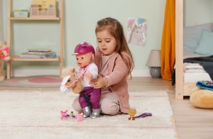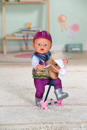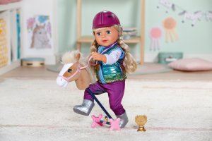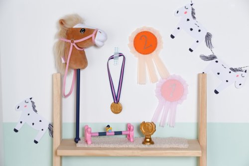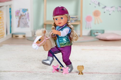 BABY born sada na Hobby horsing pro panenky s koníkem na tyči a doplňky na závody. • Panenky se mohou zapojit do hobby horsingu • Koník má měkkou plyšovou hlavu pro skvělé vyjížďky • Kačenka Berta se postará o zábavný trénink • Medaile a vítězný pohár pro šampiony • Vhodné pro panenky velikosti 36 cm a 43 cm