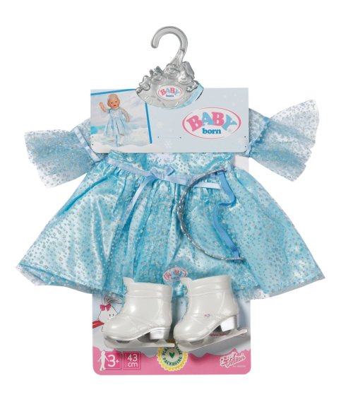 BABY born ve třpytivých šatech pro ledové princezny nejde přehlédnout. V krásných bruslích snadno klouže po zamrzlém jezeře s Teddym a Carlou. K šatům patří i diadém, který skvěle drží na hlavě během všech piruet.