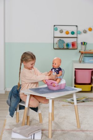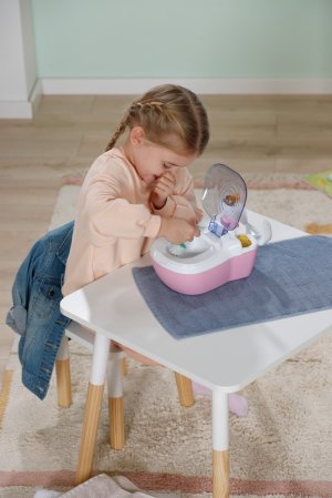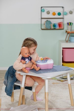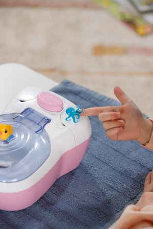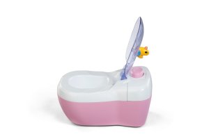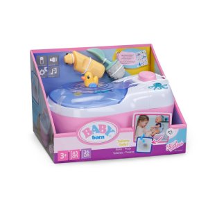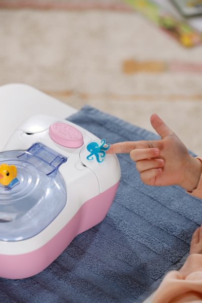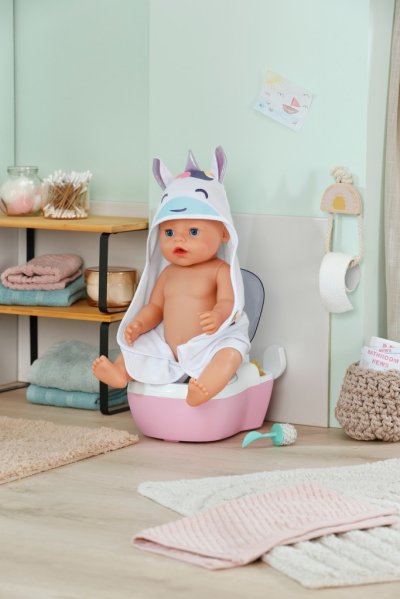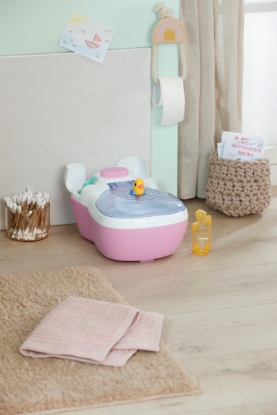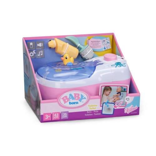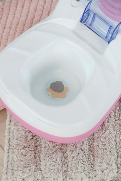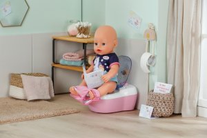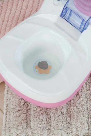 BABY born toaleta s vodním překvapením a legračními zvuky. • Legrační zvuky a melodie: Jakmile BABY born sedí na toaletě, uslyšíte šplouchající zvuky. Pokud zůstane na toaletě sedět dostatečně dlouho, začne hrát vtipná melodie. Poté zazní zvuk splachování. • Kouzlení s vodou: Když se do toalety nakape voda, objeví se v ní obrázek čůrání a kakání. • Hravý trénink hygieny: WC štětka a lahvička na čisticí prostředek pomáhají udržovat toaletu čistou a lze je uložit do praktických přihrádek. • Kreativní design: Barevné samolepky s obrázky podvodního světa slouží k ozdobení toalety.