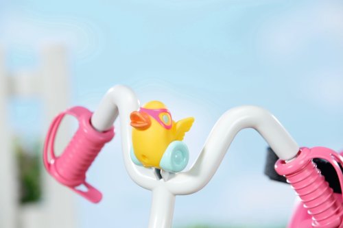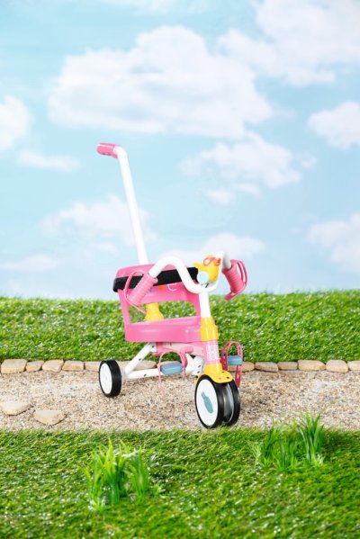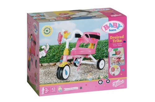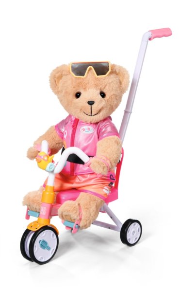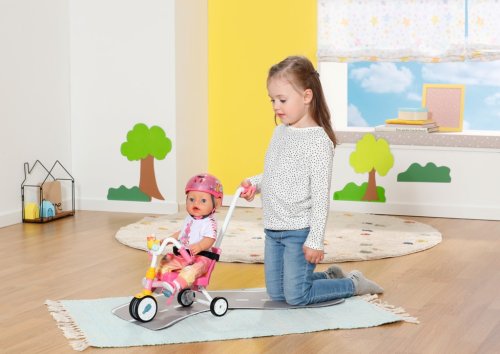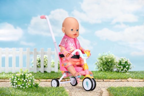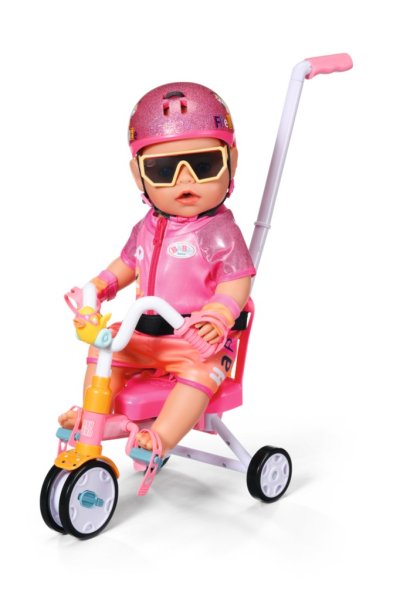 Pozor, přijíždí BABY born! Na své nové tříkolce závodí s medvídkem Teddym a kamarádkou Evou. Díky funkčním kolečkům může BABY born na své tříkolce jezdit jako na skutečné tříkolce. Klakson ve tvaru kačenky Berty se postará o to, aby se jí nikdo nepřipletl do cesty. Poutka na pedály a bezpečnostní pásy zajišťují bezpečnou jízdu. Aby BABY born nemohla jednoduše sama odjet, je k dispozici odnímatelná 45 cm dlouhá vodící tyč, kterou lze k tříkolce připevnit. To znamená, že BABY born lze na tříkolce také vozit na procházky a tlačit ji, pokud jí příliš ztěžknou nohy. V animovaném seriálu pro děti se BABY born Emma na tříkolce vydává na dobrodružnou cestu s kamarádkou Evou a medvídkem Teddym a společně vyrážejí za padající hvězdou. Pokud chcete zažít vzrušující dobrodružství s nimi, podívejte se na náš kanál BABY born v češtině na YouTube.