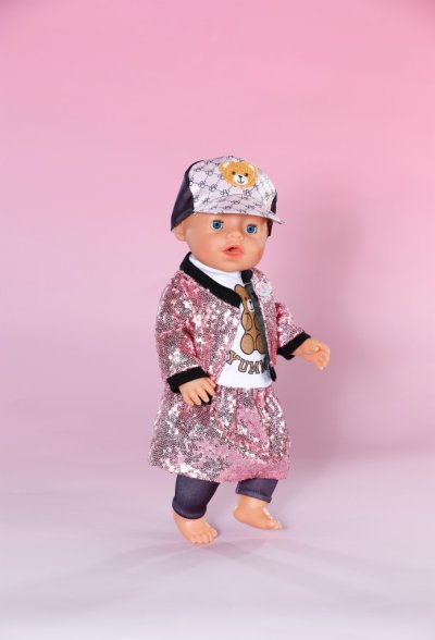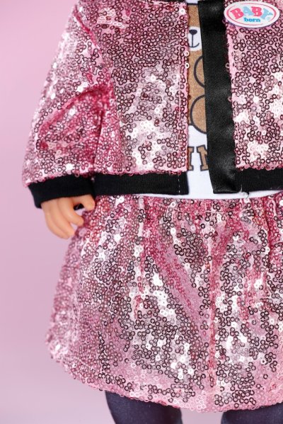 Růžové flitry na sukni a bundě nádherně září. I zbytek outfitu je opravdu stylový a stojí za to ho vidět! • Outfit s růžovou flitrovou bundou, sukní, tričkem, čepicí a legínami • Vhodné pro panenky velikosti 43 cm a pro medvídky BABY born Teddy • S ramínkem z recyklovaného materiálu • Kvalitní oblečení a doplňky pro radost z nápadité, rozmanité a dlouhotrvající hry