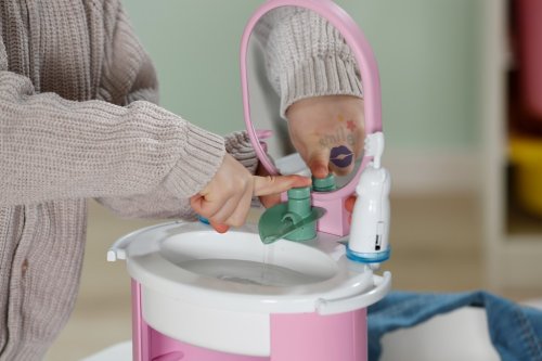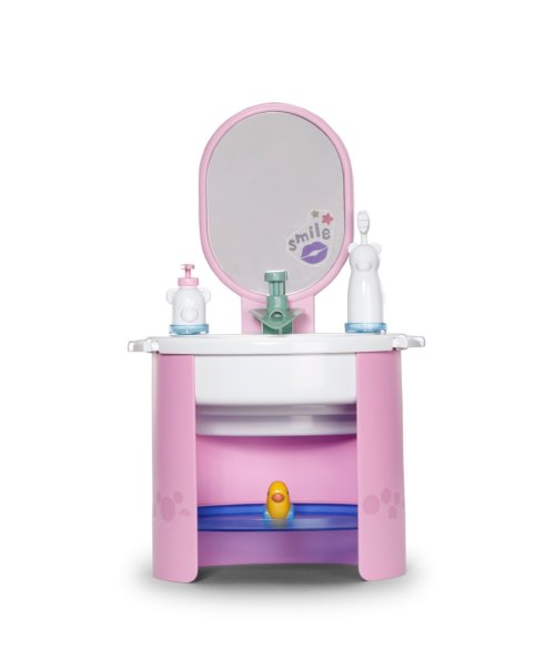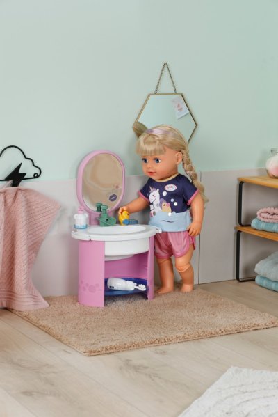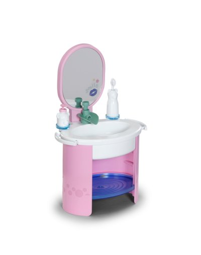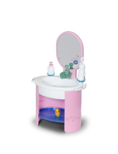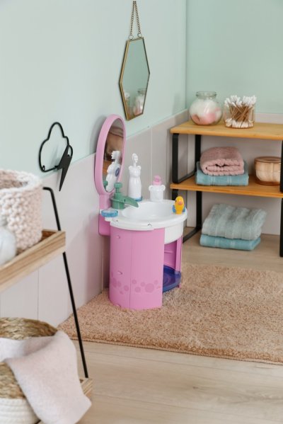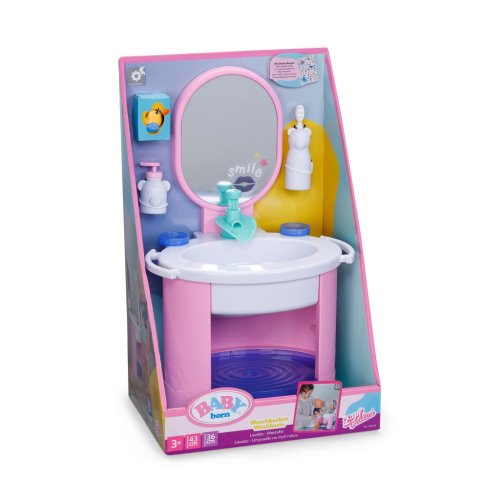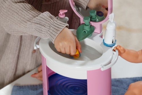 BABY born umyvadlo funguje bez baterií. S kartáčkem na zuby a s dávkovačem mýdla. • Zábava se skutečnou vodou: Umyvadlo lze napustit vodou, která se do umyvadla dostává pumpováním kohoutku. • Legrační špunt Berta: Malá kačenka pomáhá zadržet vodu – pro ještě více herních možností. • Kartáček na zuby a dávkovač mýdla: Kartáček na zuby s mechanickou vibrační funkcí poskytuje realistický herní zážitek. Na umyvadle nesmí chybět ani dávkovač mýdla. • Úprava podle sebe: S barevnými samolepkami podvodního světa si malí rodiče panenek mohou umyvadlo ozdobit dle libosti. • Vhodné pro děti od 3 let.