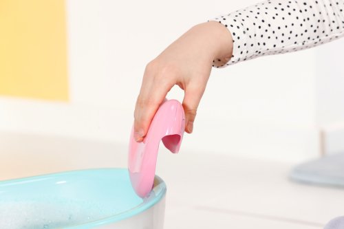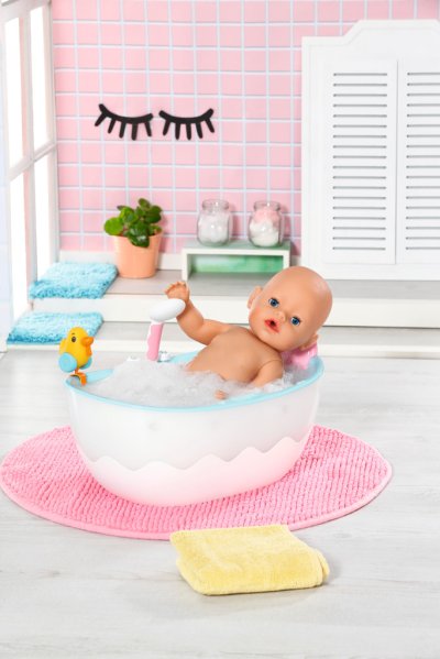 Zamířit, vystřelit… trefa! Starší bratříček je teď pěkně mokrý. S takovou kačenkou se dá ve vodě skvěle bojovat. Můžeš ji umístit na různá místa po okraji vany. Stejně tak i růžový polštářek. Vana je zevnitř modrá jako voda a zvenčí bílá s vyznačenou vlnkou. Když stiskneš tlačítko vedle sprchy, vnější plášť vany se rozsvítí v různých barvách. Sprchové tlačítko aktivuje bílo-růžovou sprchovou hlavici. Pokud je vana prázdná, uslyšíš šplouchání a typické zvuky vody. Pokud byla vana předem naplněna vodou, teče ze sprchové hlavice voda. Sprchovou hlavici lze naklonit směrem do vany, aby se neztratila ani kapka vody. Hadici je možné vytáhnout, aby se panenka BABY born mohla důkladně osprchovat.