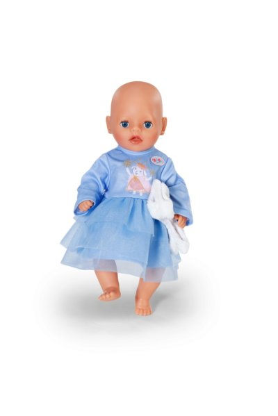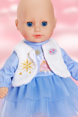 BABY born Zimní šaty s dlouhými rukávy, tylovou sukýnkou a plyšovou vestou pro panenky velikosti 36 cm. • Modré šatičky s dlouhými rukávy a tylovou sukýnkou • Plyšová vesta, která udrží panenku v teple • Vhodné pro všechny panenky velikosti 36 cm • Díky jednoduchému střihu zvládnou panenku obléknout i ti nejmenší • Hravé pastelové barvy