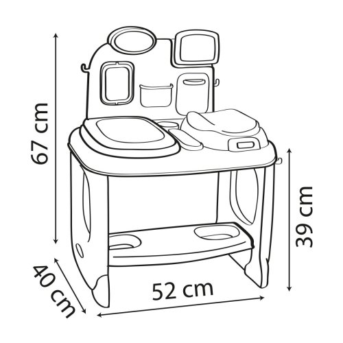 Baby Care centrum umožňuje dětem hrát si na dětského lékaře, vyšetřovat a léčit drobné bolístky jejich panenek, vhodné pro panenky do 38 cm. Skládá se z několika herních ploch a obsahuje spoustu doplňků: samolepící lékařský štítek, lékařské brýle, elektronický tablet (baterie nejsou součástí dodávky), otočná obrazovka s testem zraku a srdečního tepu, brožurka zdravotních záznamů a lékařské formuláře. Součástí je i dětská váha, teploměr, vyšetřovací stůl , stetoskop, otoskop a další. Celkem obsahuje 26 ks příslušenství. Nechybí úložný koš, lékárnička s výklopnou zásuvkou, police, háčky. Vyjímatelný elektronický tablet umožňuje hrát si a povzbuzovat dítě ke hře s panenkou a doplňky. Náhodně se spouští LED a zvuk, který dítěti signalizuje, co je špatně a co má dělat. 3 tlačítka na tabletu, několik zvuků. Dětská panenka není součástí balení. Vyrobeno ve Francii.
