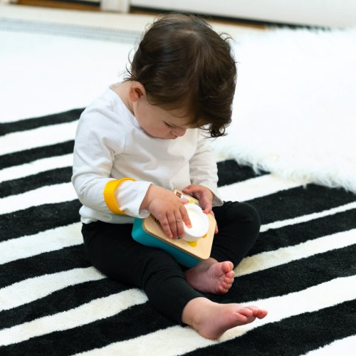 Učení barev je hračkou s hračkou fotoaparát Baby Einstein + Hape Learning Lens. Dvě interaktivní funkce zapojují děťátko do hry a učení barev a zdokonalují příčinu a následek a jemné motorické dovednosti při každém stlačení a otočení. Otočte objektiv fotoaparátu, abyste zaostřili na učení barev. Miminko se může naučit 6 názvů barev ve 4 jazycích (angličtina, španělština, francouzština a němčina), vidět, jak se čočka rozzáří ke každé barvě, a užívat si melodie a zvuky. Stiskněte tlačítko spouště a „vyfoťte“ své oblíbené postavičky Baby Einstein! Pokaždé, když děťátko stiskne tlačítko, objeví se „fotka“ a děťátko může slyšet skutečné zvuky závěrky, aby naučilo příčinu a následek. Dřevěný povrch fotoaparátu inspirovaný Montessori s certifikací FSC a retro design děťátko snadno drží a uchopuje. Řemínek umožní vašemu malému prckovi vzít si tuto hračku na cesty a vypadat jako skutečný fotograf.
