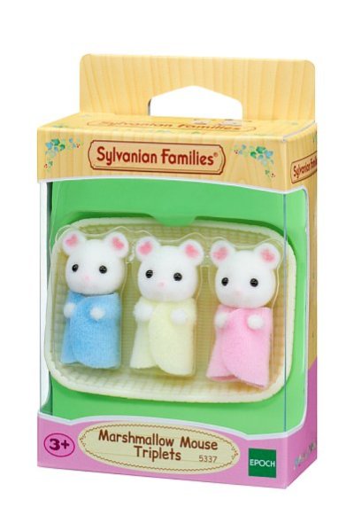Baby Marshmallow myšky trojčata jsou neuvěřitelně roztomilá miminka. Sada obsahuje trojčátka a kolébku. Figurky jsou vyrobeny z plastu, který je potažený jemňoučkým sametem. Očička jsou z černých korálků. Všechny končetiny jsou pohyblivé a hlavička otáčecí. Oblečení je vyrobeno tak, aby se dalo opakovaně svlékat a oblékat. Rozkošné Marshmallow trojčátka jsou charakteristická svými okvětními plátky v uších. Jedná se o první trojčátka z rodin Sylvanian. Všechny tři děťátka můžete uložit ke spinkání do nádherné kolébky. Užijte si ještě více zábavy s rodinkou Marshmallow myšek (5308, prodejné samostatně) a Baby Marshmallow myškou (5336, prodejná samostatně). Kombinujte s domečky, nábytkem a hra se stane ještě zábavnější (prodejné samostatně). Produkt obsahuje: 3x Baby Marshmallow myšky (modrou, žlutou a růžovou), kolébku. Věk: 3+.
