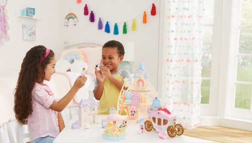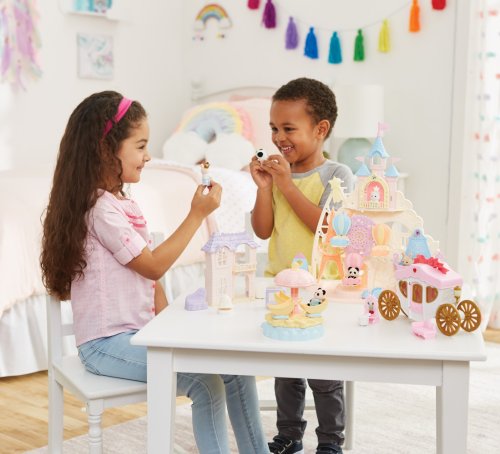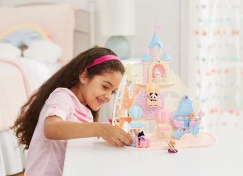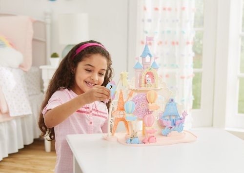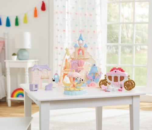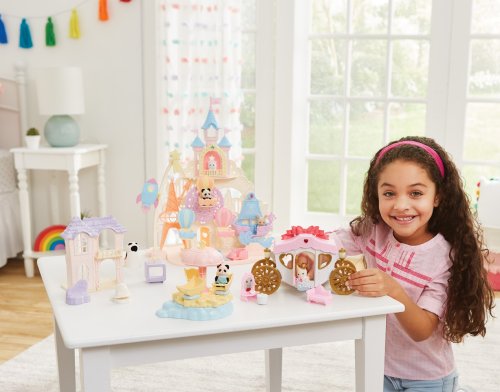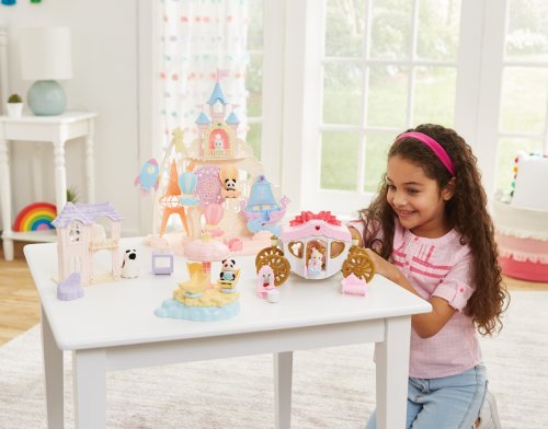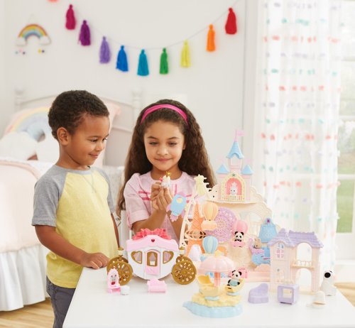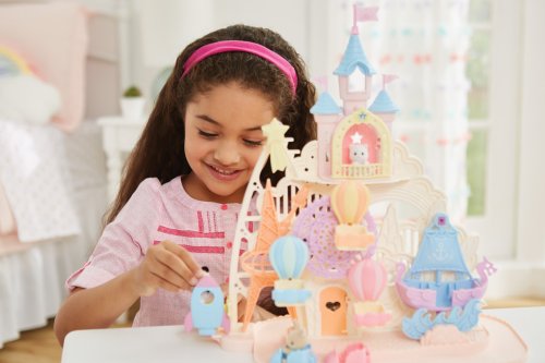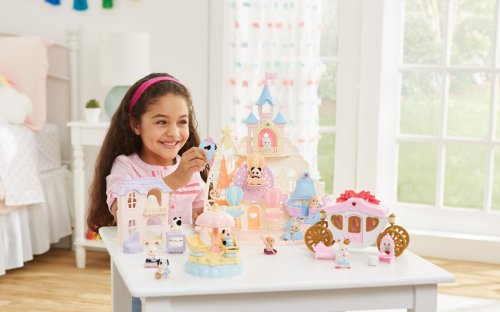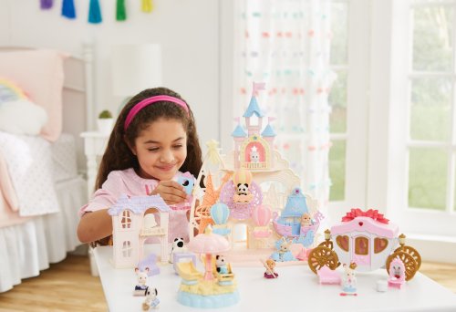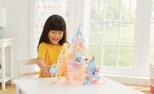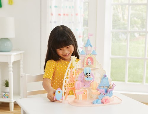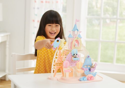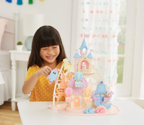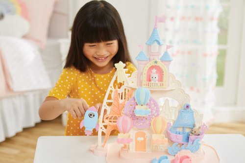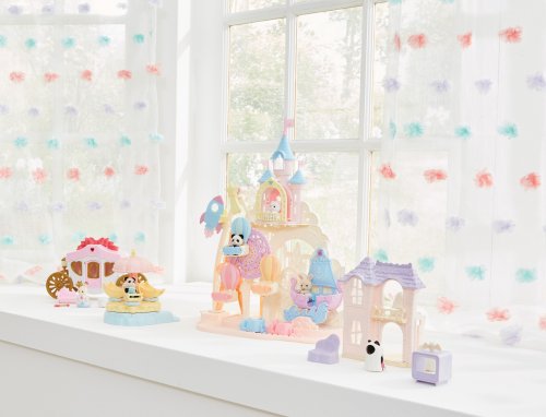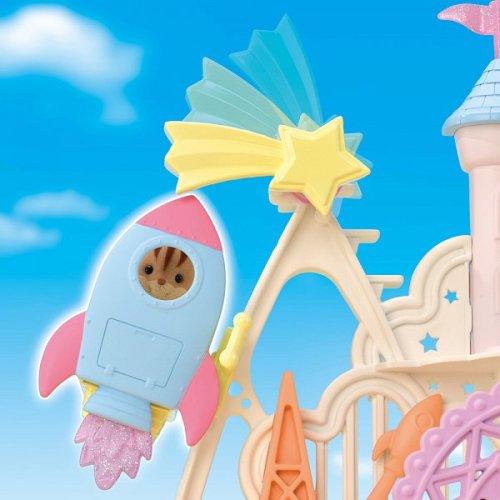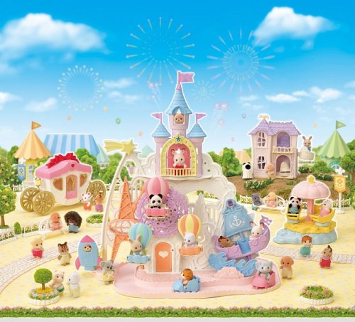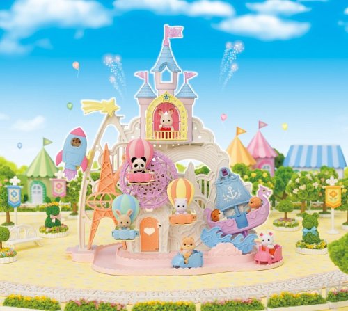 U velkého lesa za vstupní branou leží kouzelný svět a v něm se nachází Baby zábavný park. Kamkoliv vaše oko dohlédne, uvidíte veselé Baby figurky, které si užívají čas strávený v Baby zábavném parku. Součástí Zábavného Baby parku ve tvaru hradu je ruské kolo, vikingská loď, dráha s autíčky a vesmírná raketa. Na točící se ruské kolo, se sedačkami ve tvaru horkovzdušného balónu, lze usadit tři baby figurky. Dvě baby figurky se mohou houpat na vikingské lodi. Na pohyblivou raketu lze umístit jednu baby figurku. Další baby figurky si mohou prohlédnout Baby zábavný park z hradního balkonu. Otevřete dveře a projděte do zadní části parku, kde uvidíte druhou část trasy pro autíčka a stůl se židlemi, kde si mohou baby figurky sednout a povídat si. V zadní části Baby zábavného parku je místo až pro 30 baby figurek. Součástí sady jsou tři baby figurky – Baby Pookie Panda, Baby Milk králíček a Baby Perská kočička. Pro ještě větší zábavu můžete Baby zábavný park zkombinovat se sadou Baby hvězdný kolotoč (5539, prodává se samostatně), Strašidelným domem (5542, prodává se samostatně) a Rodinným růžovým autem Van (5535, prodává se samostatně). Herní sady a figurky Sylvanian Families jsou nadčasové a vysoce kvalitní hračky. Hra podněcuje představivost dítěte. Obsahuje: 1x základna, 1x hrad, 1x velká vlajka, 2x malá vlajka, 3x gondola (růžová, modrá, žlutá), 1x vikingská loď, 1x vlny, 1x raketa, 2x autíčko (modré a růžové), 1x kometa, 1x Baby Pookie Panda sedící, 1x Baby Milk králíček sedící, 1x Baby Perská kočička sedící. Věk: 3+