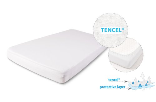 Nepromokavé a prodyšné přiléhavé prostěradlo Tencel®. Pravděpodobně se ptáte, co je Tencel®? Je to celulózové vlákno, které kombinuje vlastnosti mnoha jiných vláken, je jemné jako hedvábí, pevné jako polyester, chladivé jako len, hřejivé jako vlna a savější než bavlna.