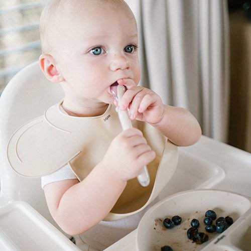 Silikonový bryndák se dokonale přizpůsobí tvaru dítěte, čímž mu poskytuje pohodlí. Díky zaobleným okrajům bryndák chrání větší část oblečení dítěte před znečištěním. Ideální pro objevování nových chutí bez obav z nečistot.