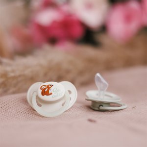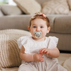 Anatomický silikonový dudlík pomáhá uklidnit miminko a dopřeje všem chvilku odpočinku. Vypuklá horní a zploštělá spodní část dudlíku se dokonale přizpůsobí ústům dítěte a podporuje zdravý vývoj patra a skusu. Profilovaný štítek s otvory umožňuje volné dýchání a zajišťuje cirkulaci vzduchu kolem úst. Náustek je vyroben z hypoalergenního, bezpečného silikonu, který je odolný vůči poškození a neobsahuje BPA. Balení obsahuje 2 dudlíky pro děti ve věku 6-18 měsíců – jeden pro denní použití a jeden se svítící rukojetí, ideální pro noční zklidnění.