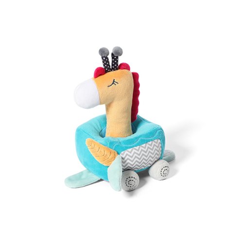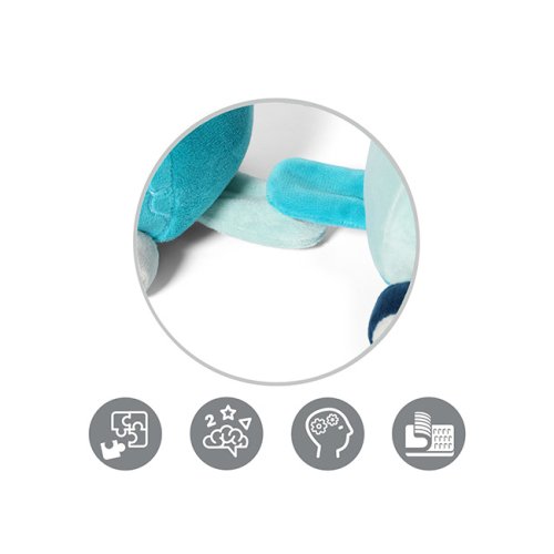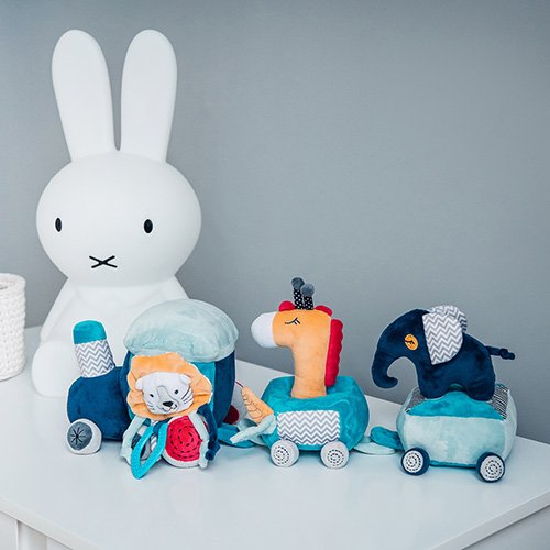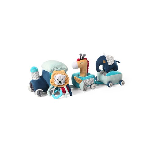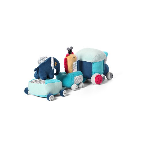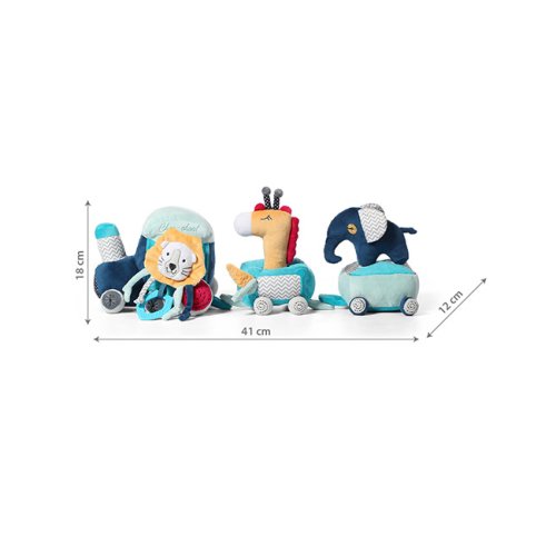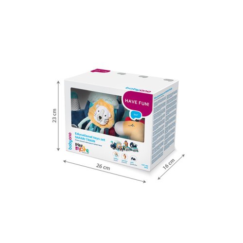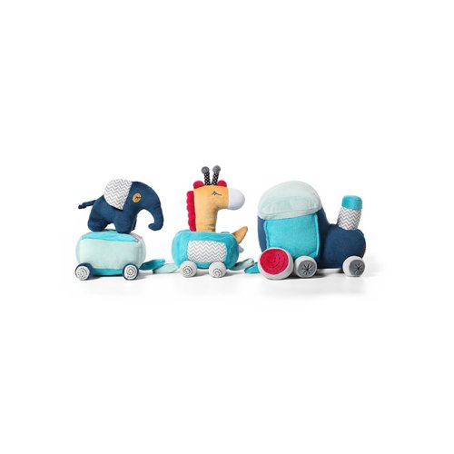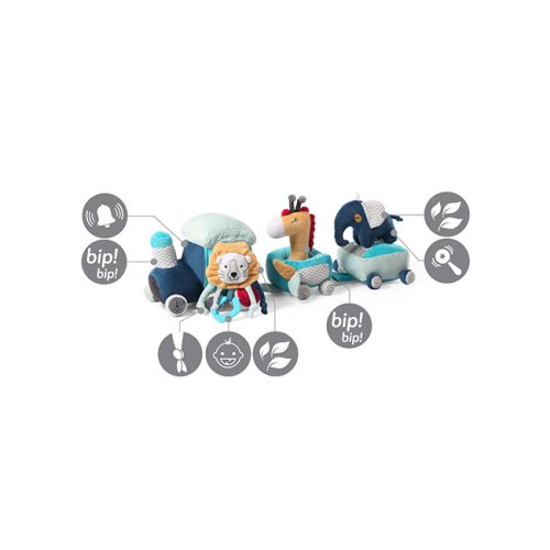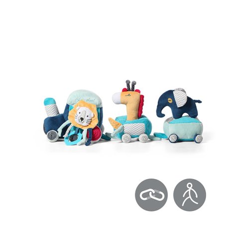 Vláčková sada vzdělávacích hraček Safari train se skládá z lokomotivy se dvěma vagóny a připojenými plyšovými hračkami: pískajícími, chrastícími a šustícími. Hračka seznamuje dítě s rozmanitým světem barev, zvuků a tvarů. Díky přichycení na suchý zip a důmyslně navrženým prostorům pro hračky lze vytvářet zajímavé kombinace, které podněcují kreativní myšlení.