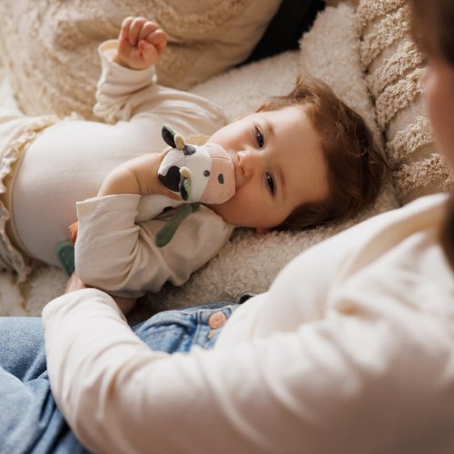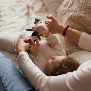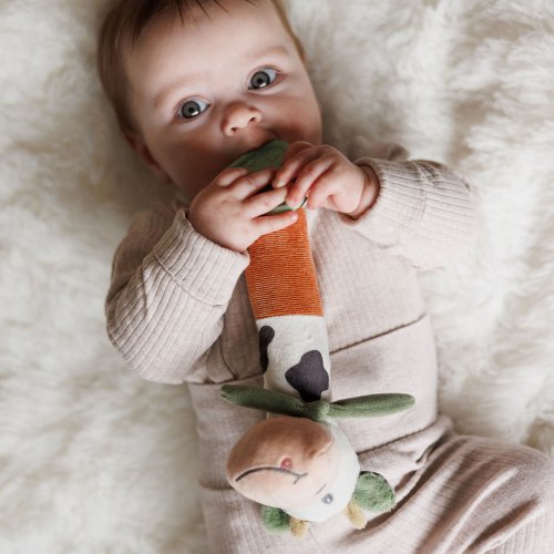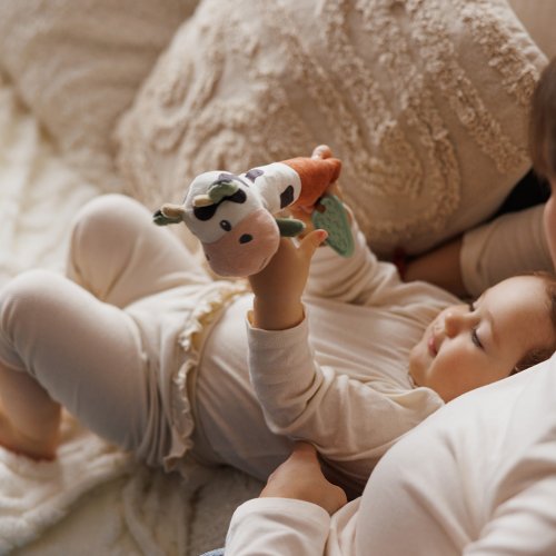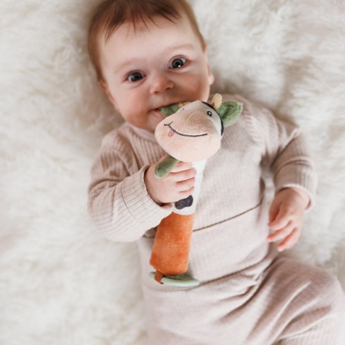 Rozkošná plyšová pískací hračka Cow Bingo je dětská hračka, která probouzí zvědavost a podporuje její vývoj. Vaše dítě objevuje svět všemi smysly - dívá se, dotýká se, poslouchá a kouše. Různé barvy přitahují pozornost a měkká ouška a uzlík povzbuzují malé ručičky k hmatání. Dlouhé, měkké tělo usnadňuje uchopení a vaše dítě rozvíjí jemnou motoriku a koordinaci ruka-oko. Tato interaktivní hračka stimuluje sluch – když ji vaše dítě stiskne, slyší zvuk. Na konci dětské pískačky jsme umístili kousátko s výstupky, které jemně masíruje bolavé dásně.