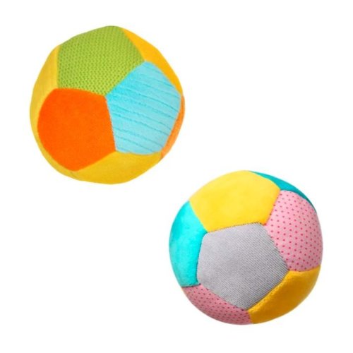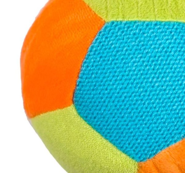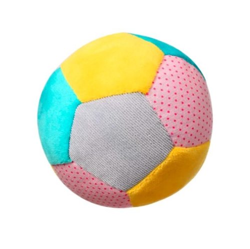 Pestré, kontrastní barvy uspořádané do geometrických pětiúhelníků zaměřují vidění dítěte a pomáhají rozlišovat barvy. Jemný zvuk zvonku uvnitř hračky podporuje hraní. Měkkost míče podporuje její uchopení a přesunutí z jedné ruky do druhé.